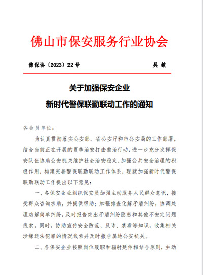 佛山保安協會發布關于加強警保聯動工作通知